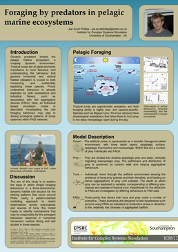My PhD research at Southampton University was based at the School of Ocean and Earth Sciences and the Institute for Complex Systems Simulation. My project examined pelagic tuna species, who inhabit the water column in open ocean and coastal areas, and travel vast distances as large aggregations in both the hunt for and flight from other species in this ecosystem. The impact on commercial, pelagic fish species from industrial fishing practices are increasingly being identified as more complex than a simple exploitation of biomass. The use of fish aggregation devices by purse-seine fleets affects both the behaviour and physiological condition of fish such as tunas, and whilst these impacts have been clearly observed in recent years, the exact nature of the processes causing them remain unknown. My research focussed on the individual-scale vertical movement behaviours of tropical tuna, using individual-based modelling and developing new classification methods to examine the inter-species and inter-individual variability of behaviour in the context of modern fishing gear interactions.