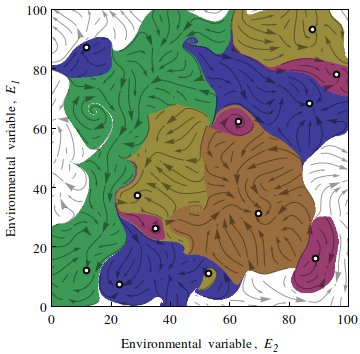 Distinct, complex attractors form (coloured regions) shown here for a two-dimensional environment. The time evolution of the system is along streamlines, towards fixed points (open circles).
