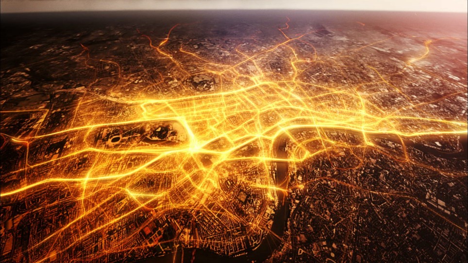 This image, showing taxi driver route choices through central London (brightness of road indicates higher usage), highlights the impact of each driver choosing their route based on information available to them from personal experience, information system