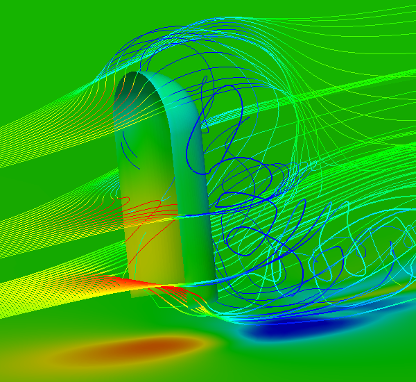 Flow development on a spinnaker-type device, composed by a cylindric body and a spheric head. The analysis is performed with OpenFOAM