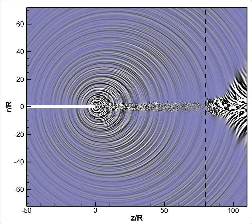 Aero-engine manufactures have so far been able to considerably reduce jet noise by increasing bypass ratios. Further progress on noise reduction now depends on a detailed understanding of the exact noise generation mechanisms. It is widely recognised that both large-scale structures and fine-scale turbulence contribute to the overall sound radiated from subsonic jets and that here is an additional noise source associated with the flow separation over the sharp corner that occurs in the region near the nozzle exit. However, previous simulations of jet noise have not been able to include all possible noise generation mechanisms. In the current project the recent increase in computing power will be exploited to perform DNS of fully turbulent high subsonic Mach number jets that include the nozzle using a computational domain large enough to directly compute part of the far-field sound. With such a direct simulation approach all possible noise generation mechanisms will be included.