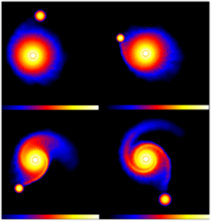 SPH simulations showing a neutron star (the small point-like object) orbiting and interacting with a massive B-type star surrounded by a circumstellar disk.