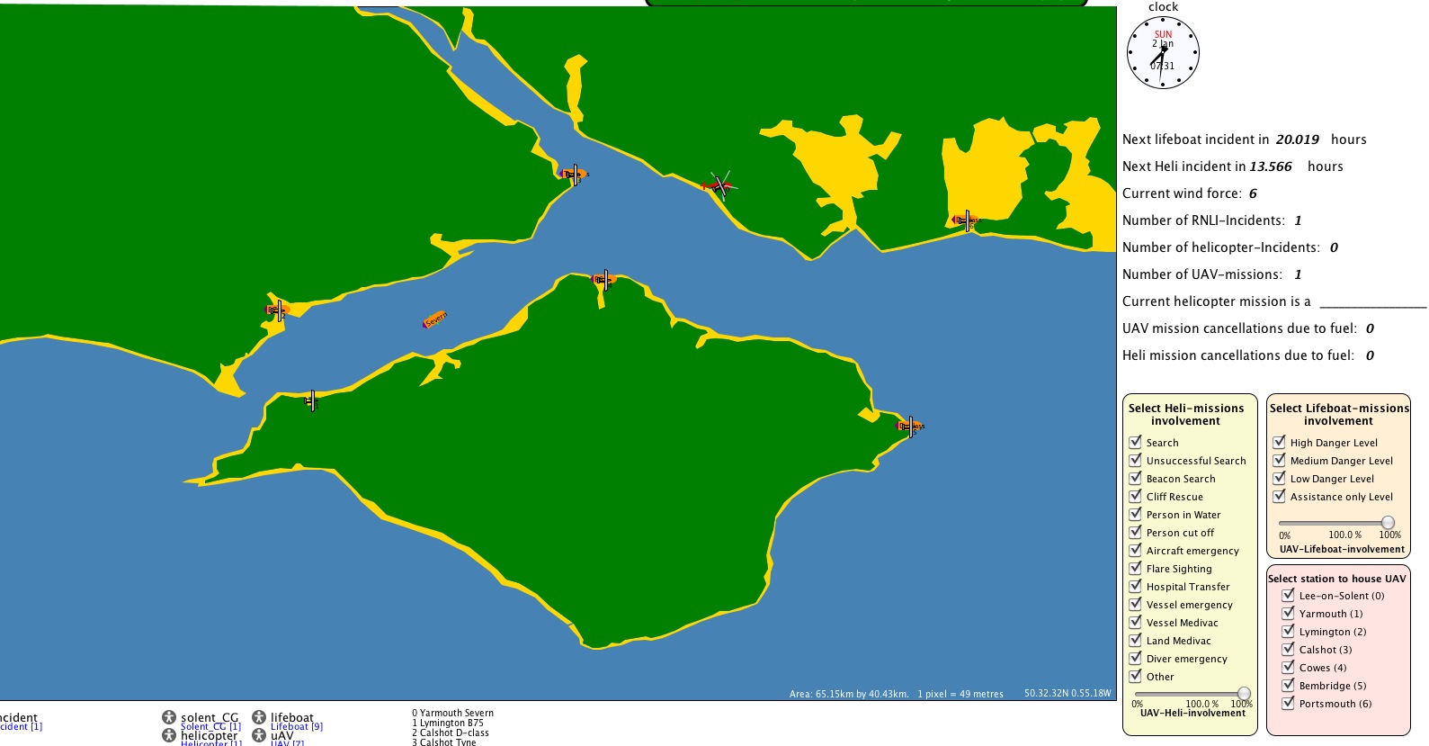 As part of the DECODE-research project within the School of Engineering Sciences, this project models the Search-and-Rescue (SAR) environment of the Solent. DECODE is developing Unmanned Air Vehicles (UAVs) for SAR activities. Its requirements, design specifications and costs are investigated within this project. This is necessary in order to optimise the aircraft design before production and enable maximum cost benefit for possible SAR-customers such as the RNLI, MCA and MoD. The simulation is Agent-based and includes several key features: