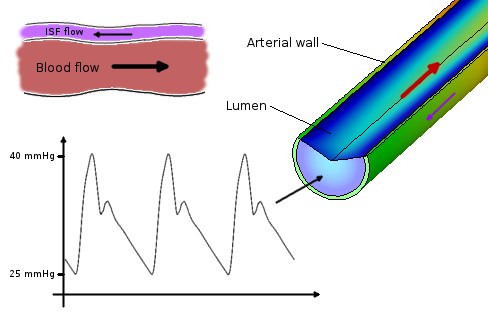Schematic of perivascular drainage. The blood flow is driven by a pressure pulse into the brain, whereas interstitial fluid (ISF) drains out of the brain in the reverse direction via the arterial wall.