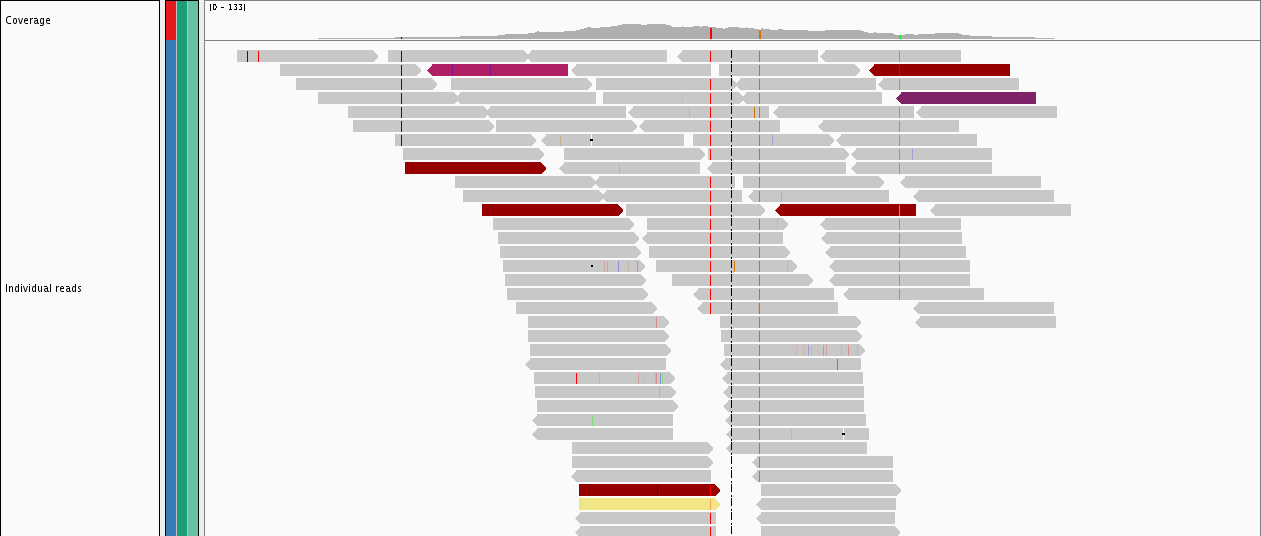 NGS short reads aligned to the human genome for one exon. Mutations are seen as coloured vertical lines on reads.