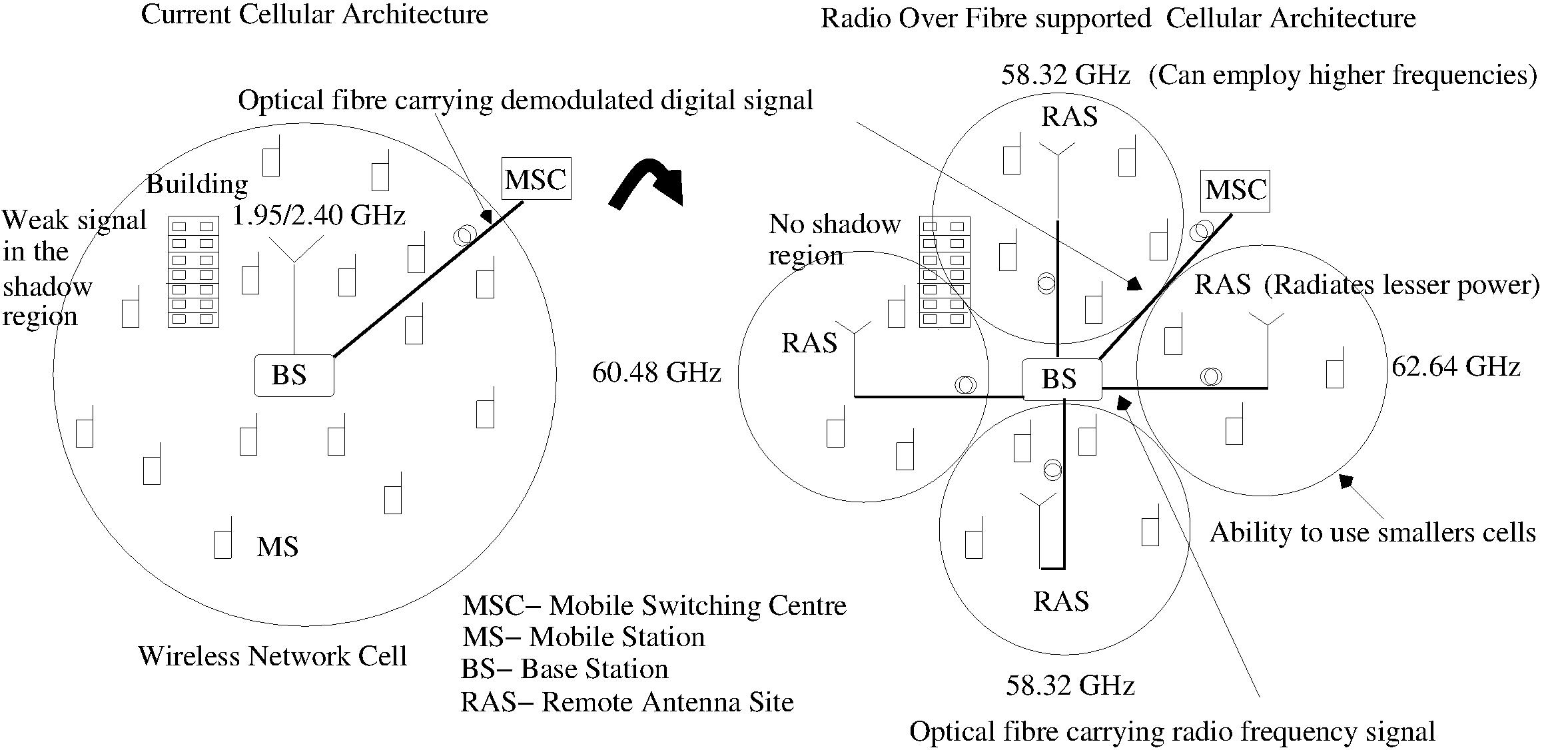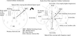 Radio Over Fiber (ROF) communication is an optical/wireless integration technique that would support the next generation of high-speed, ubiquitous wireless services. It involves transmitting radio frequency signals to and from a base station, which applies centralised processing to the signals that are received from a number of remote antennas as well as to the signals that are transmitted to the remote antennas. Little or no signal processing is done at the Remote Antenna Sites (RASs). The transmission and reception takes place through the high-bandwidth, low-attenuation optical fibres, in an effort to improve cellular coverage, capacity, data rates and power efficiency. These advantages have been illustrated in the accompanying figure. This technique enables a wireless network to support a large number of RASs, while keeping the cost per RAS low. Moreover, it enables efficient utilisation of the existing optical fibre networks and their employement in Heterogenous Networks (HetNets).