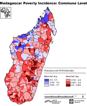 A poverty map of Madagascar produced by The World Bank which uses the most popular methodology. Amongst other findings, my work demonstrates that this method makes assumptions about the population which, if not fulfilled, can produce inefficient estimates