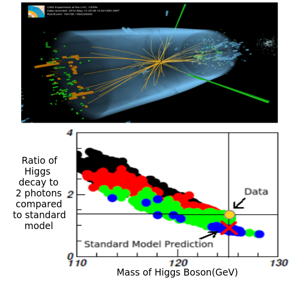 Top: A particle collision producing a Higgs Boson at CERN. Bottom: A plot showing that data for Higgs decays does not agree with the Standard Model, but can be explained by the Minimal Supersymmetric Model.