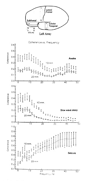 Regional differentiation is statistically significant in average coherence among pairs of loci on temporal vs frontal cortex or lateral frontal vs subfrontal strips in the same patient, but such differences are usually small. We could not test how consistent they are over hours or between patients. Differences between left and right hemispheres, whether symmetrical pairs or pooled from two or more lobes on each side, can be quite large; in our patients the right side is usually higher, especially in the waking state.