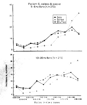 (ii) The alternative null hypothesis of no significant structure is that the fluctuations in observed values are distributed at random. We shuffled the order of the observed coherence values within each strip 1000 times and then computed the ratios of adjacent pairs of values and the means and standard deviations of their incidence in each of the 10 classes of ratios, from 0.1 to 1.0, to compare with the original, unshuffled incidence. There are significant differences between the shuffled and the unshuffled only in a few of the size classes but the small excess of the Rs >0.5 in the unshuffled data and of Rs <0.5 in the shuffled series is present in all 6 patients compared, with numbers of neighboring pairs of coherence values varying from 60-209, including all bands and both awake and asleep samples. Figure 10 shows the incidence in one patient and two bands. The hypothesis of random distribution of coherence values can be rejected; there is a higher tendency than that for adjacent values to be similar. Significant local structure is a departure from both randomness and extremely low spatial frequency. The observed distribution is quite unlike both extreme cases - smoother than the stochastic model and more structured than the large-scale-without-features model.