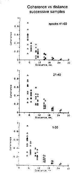 In order to investigate the basic question whether there is non-random structure at the resolution offered by available electrode spacing, we looked at the coherence values for adjacent pairs along each strip of subdural electrodes and along the depth electrode arrays. Graphs of the coherence for individual pairs along a strip of eight (Figs. 7, 8, 9) reveal local discontinuities rather than a smooth gradation of neighboring values - that is, the spatial frequency is wideband, including millimeter wave lengths. Successive pairs, for example made up of electrodes 1 & 2, 2 & 3, 3 & 4, up to 7 & 8 are separated by 10 mm in the usual subdural strips, 5 mm in the several cases with finer spacing. Note that adjacent pairs share one electrode.