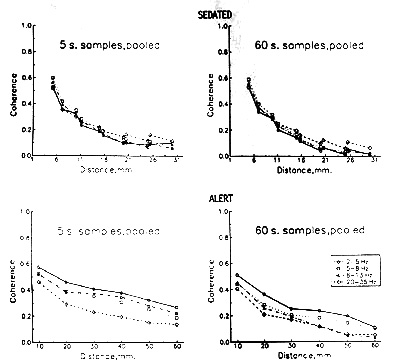 Coherence has been little studied in laboratory animals. A few studies on rabbits concern other problems. Our own study (Bullock and McClune 1989 and later, unpublished observations) showed that samples of sleeping and waking EEG in rabbits and rats, if categorized by EEG inspection, have less variability than the present samples from epilepsy patients. Sleep rather consistently shows higher coherence in all bands in rabbits, but the difference is usually slight. We concluded that the apparent synchrony is generally due to the increase in power at low frequencies; it need not mean any increase in synchrony at all. Recruitment of generators or increased excursion of voltage in each generator, without any necessary change in synchrony, could and apparently does account for most of the observed increase in amplitude.