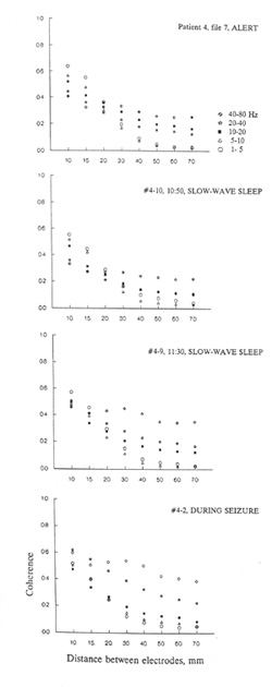 The considerable inconsistency of coherence between subjects and even samples from the same subject, in both sleeping and waking EEGs might mean that these states were abnormal in these patients or in our samples. However, the experienced neurologist who read the EEGs did not note peculiarities beyond the normal range of variation among such patients. A more systematic study is needed before generalizing on differences between states in respect to the local structure.