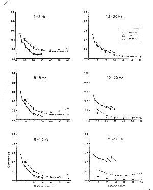 Coherence in the human EEG quite consistently falls with distance, at least within the first 40-50 mm in subdural (Figs. 2-5) and in depth recordings (Fig. 6). At greater distances, such as between regions, lobes or hemispheres, it can level off or even rise. The steepness of decline in the first 40-50 mm varies, but not greatly. It approximates linearity on a semi-log plot (log distance) but is somewhat steeper at shorter distances. We can justify plotting to a coherence value of 1.0 at zero distance and then note that the slope tends to be steeper in the first 10 mm and in the higher frequency bands, except for the 35-50 Hz band where it comes back to a shallower slope. The mean subdural coherence for electrodes 10 mm apart (C10mm) is usually 0.4-0.5 in the awake, interictal state for EEG in frontal, temporal and parietal cortex. For comparison with other species, the typical distance for a coherence of 0.5 (D0.5) is 5-10 mm, subdurally, and 9-20 mm with depth electrodes in the region of the hippocampal formation.