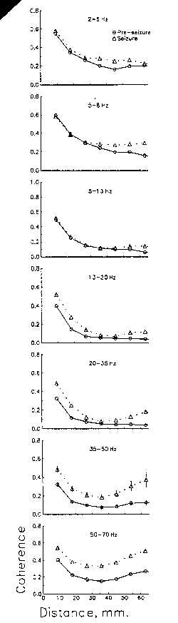 The depth recordings from medial temporal loci show that coherence averaged over 3 seizure episodes, for 30 seconds or more each, almost always increases above that in the pre-seizure period by 0.05 to 0.2 in all bands except the 5-8 Hz band. Other occasional exceptions are no increase or even a decrease in the 8-13 Hz band and even in the 35-50 Hz band. Shorter samples of EEG during seizures vary widely, as expected from the profound changes both in form and localization of the activity between the moment which the electroencephalographer designates as the start of a seizure and the maximal electrical paroxysm. In the last named stage, when the maximum number of channels are involved, the coherence is close to maximal (but rarely 1.0) in the higher frequency bands - especially above 15-20 Hz.