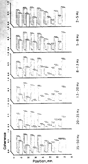 Comparison of the coherence between pairs of loci in the depth recordings, mainly from the hippocampus, with the coherence values between pairs of subdural loci, mainly from parietal, temporal and frontal cortex, faces some asymmetries of unknown significance. The electrodes are of different form, so that more surface area is in contact with brain tissue in the depth electrodes than in the surface arrays. The spacing is 5 or 10 mm in the latter and 6.5 or 9 mm in the former. Still, the differences in mean coherence in the alert, interictal state are probably real and not only due to such asymmetries. The mean coherences for 6 bands pooling at least one minute of EEG from all 10 mm subdural pairs in 7 patients in this state range from 0.34-0.47; the means of three 20 s pre-seizure samples of all 9 mm pairs of deep temporal electrodes in the two subjects with that spacing range for the same bands from 0.48-0.61 (Table 1).
