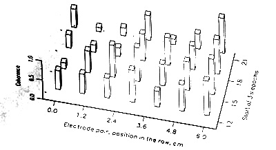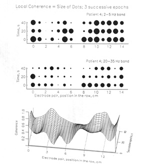 Previous work on EEG coherence in rats and rabbits (Bullock and McClune 1989) showed that coherence between pairs of electrodes on the pial surface falls with distance from the maximal value of 1.0, which it must have at a small enough distance in a volume conductor so that the cones of tissue seen by the two electrodes overlap virtually completely, to values around 0.5 at ca. 3-6 mm, when averages were computed over tens of seconds of EEG from many electrode pairs for each distance. This rather steep decline, and the wide variance between pairs, suggested that there might be structure in the millimeter domain. The next step to be taken was to look at individual pairs of electrodes, instead of pooling all pairs with the same separation, to discover whether there are signs of local differentiation, whether they are stable over at least several seconds and whether they are characteristic of cortical areas or states. The opportunity to do this in human data arises from the availability of EEG records recorded with arrays of subdural and depth electrodes routinely implanted in patients with intractable epilepsy (Engel et al. 1990; Mackenzie et al. 1990; Mihara et al. 1992; Duckrow and Spencer 1992; Garcia de Leon 1993; Kanner et al. 1993). Signs of fine structure in the distribution of coherence are not expected in the usual scalp records of the human EEG, in which each electrode sees a large cone of brain tissue.