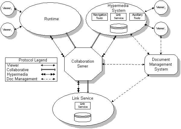 It may be the case that support for collaboration in contemporary hypermedia systems is buried in the many layers of the architecture. From figure 4, it may appear that we are advocating the development of a brand new module responsible only for collaboration, but there is no reason why an existing collaborative hypermedia system cannot be adapted to comply with OHRA. All that is required is for the system to expose the appropriate functionality and adhere to the Collaboration Protocol. A partial tailoring would allow runtime components to collaborate only upon its link server, whereas a complete tailoring would allow runtime components to use its collaboration services across a variety of independent link servers.