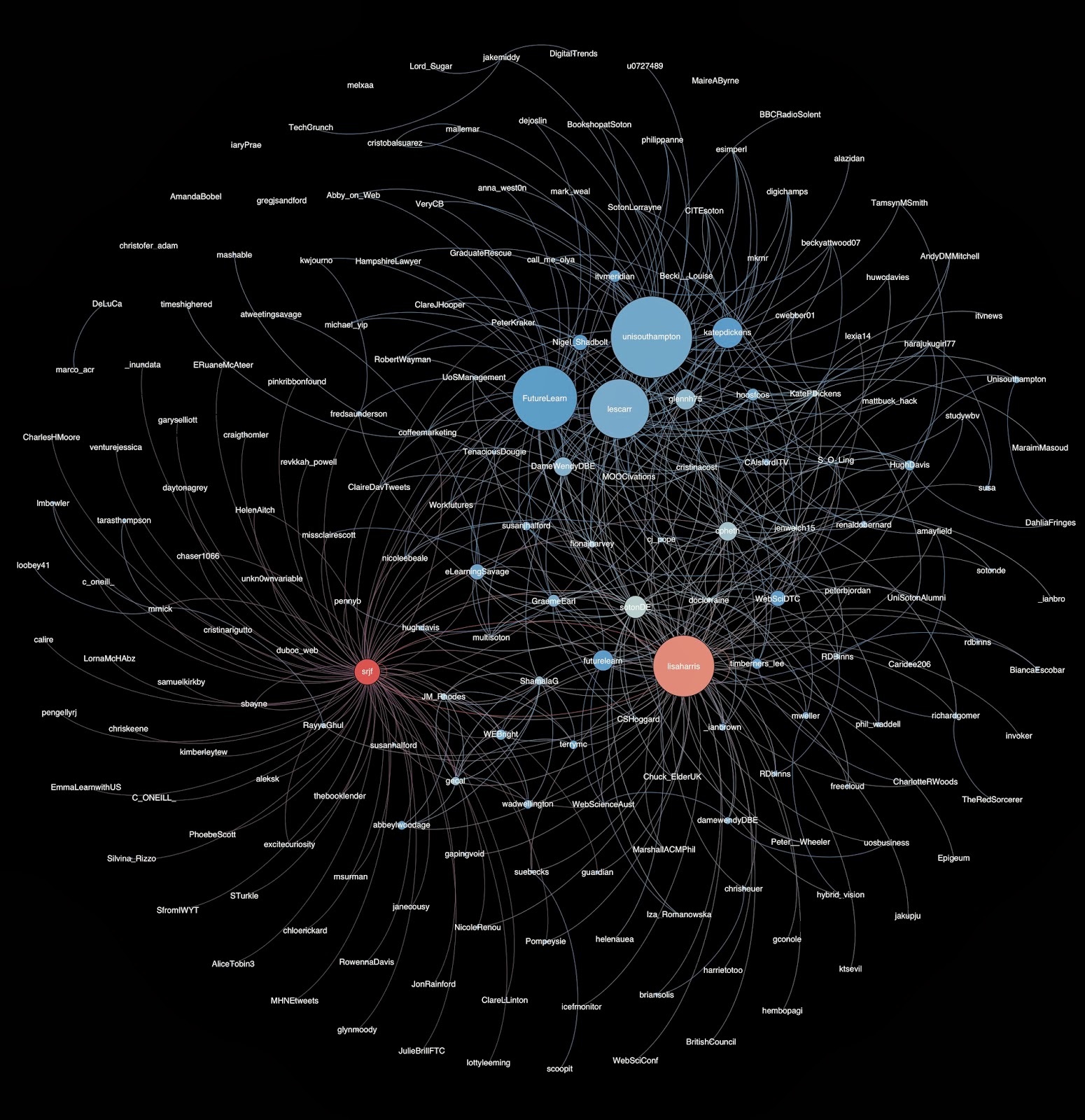 Nodes were resized based on their in-degree, so that the size of each user is proportional to the number of times they were mentioned in tweets containing the hashtag. As shown in the image above (click on it to load a large version), there are large nodes for accounts such as ‘unisouthampton’, ‘futurelearn’ and ‘lescarr’, representing the official University account, the Future Learn MOOC platform, and the lead educator on the Web Science MOOC.