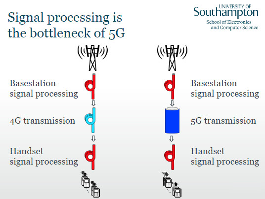 State of the art wireless communication signal processing works well in 4G. It has a throughput and a latency that are comparable to those of 4G wireless communication. However, unless new advances are achieved in wireless communication signal processing, a bottleneck will be created in 5G. It is no use having very high throughput transmission, if the corresponding processing cannot be completed with an equally high throughput - the overall achievable throughput is limited to that of the weakest link in the chain. Likewise, it is no use having a very low latency transmission, if the corresponding processing cannot be completed with a very low latency - the overall latency is given by the sum of the latencies in the chain.