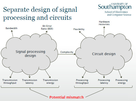 The conventional approach to signal processing research is preventing the required advances - Traditionally, some research groups have worked on signal processing algorithms, while others have worked on signal processing implementation. The first type of research group would typically use simulations to characterise the performance, bandwidth, throughput, latency and energy of transmissions using their proposed signal processing algorithms. They would also characterise the complexity of the signal processing algorithms. Later and often separately, the second type of research group would build hardware implementations of the signal processing algorithms and characterise their hardware resources, flexibility, throughput, latency and energy. They would often find that these different characteristics do not have direct one-to-one relationships with the complexity of the algorithms. Owing to this, some “low complexity” algorithms can be very challenging to implement. This disconnect between the signal processing design and the circuit design can lead to the mismatches between the throughputs, latencies and energy consumptions of the transmissions and the processing, causing bottlenecks of the type discussed above.