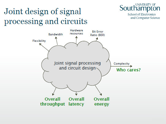 The Southampton Wireless research group takes a different approach to the design of signal processing algorithms and their implementation - we design these things jointly, taking consideration of the hardware characteristics right from the start of the algorithm design. This approach allows us to design the algorithm so that it is easy to implement and to design the implementation so that it realises the full potential of the algorithm. We jointly optimise the throughputs, latencies and energy consumptions of the transmission and the processing, so that neither imposes a bottleneck on the other. With this approach, we don’t have to worry about “complexity” - our focus is producing something that works well in theory, but also in practice. This is the approach that we have adopted in our spin-out company AccelerComm, which is commercialising our research on the joint design of signal processing algorithms and their implementation.