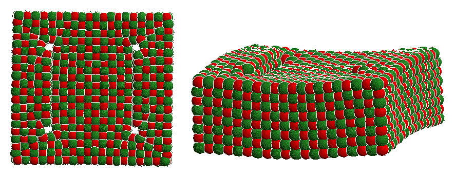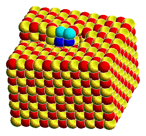 The adsorption energies of molecular units at the screw dislocation 2V were calculated so that we could follow the structural development of the growth spiral. The mechanism was found to be a three stage process with the first MgO unit adding parallel to the surface at the dislocation core. The second MgO unit added in parallel directly above the first unit to complete the step. The third and subsequent MgO units added perpendicular to the surface propagating the step as illustrated in figure 2.